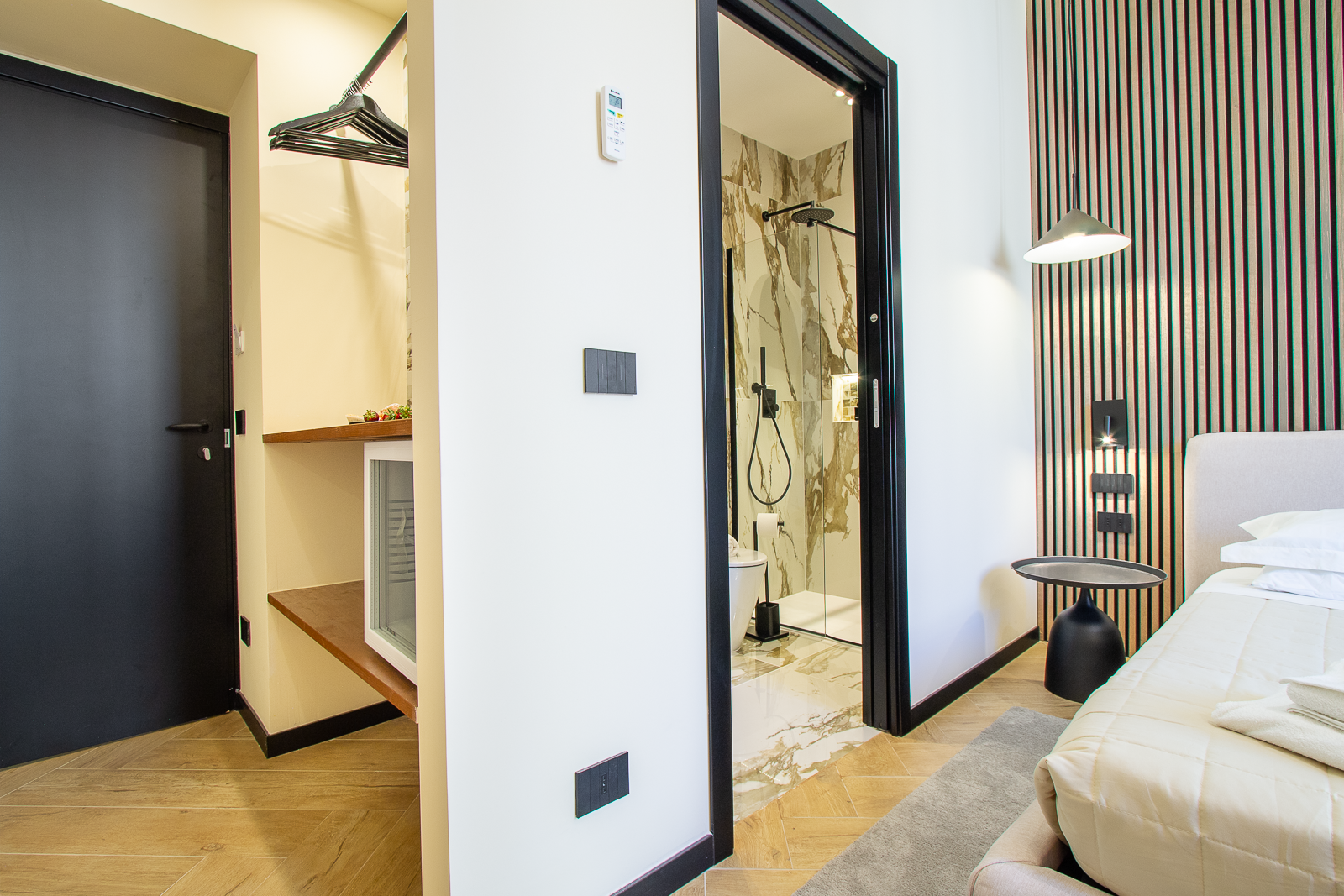 Let yourself be wrapped in soft lighting, harmonious tones, and the peaceful atmosphere that greets you the moment you enter. The designer heated towel rail not only adds a modern touch, but also provides a soothing warmth — perfect for moments of pure relaxation after exploring the Eternal City.